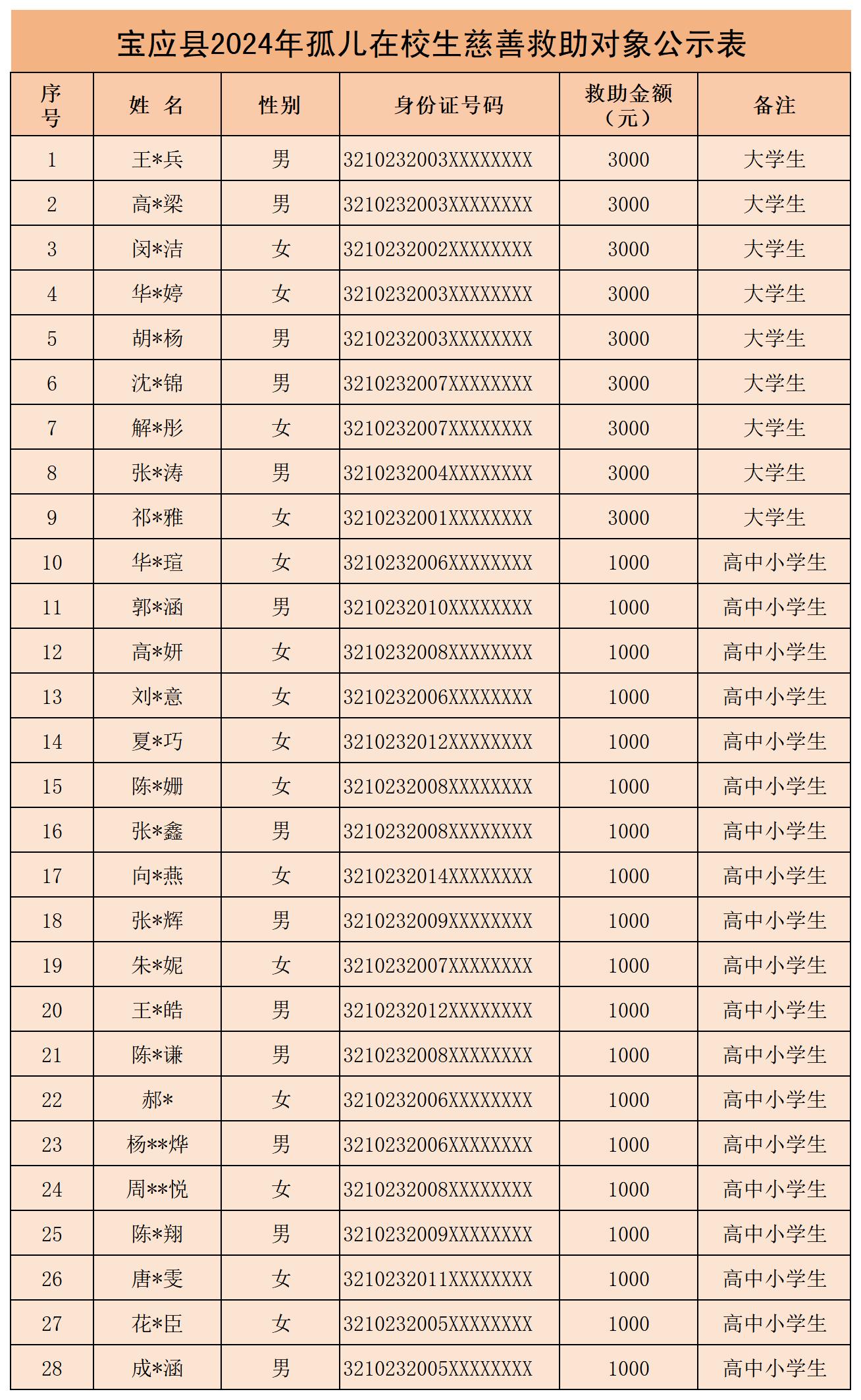 孤儿在校大学生每人资助3000元,在校高、中、小学生每人资助1000元