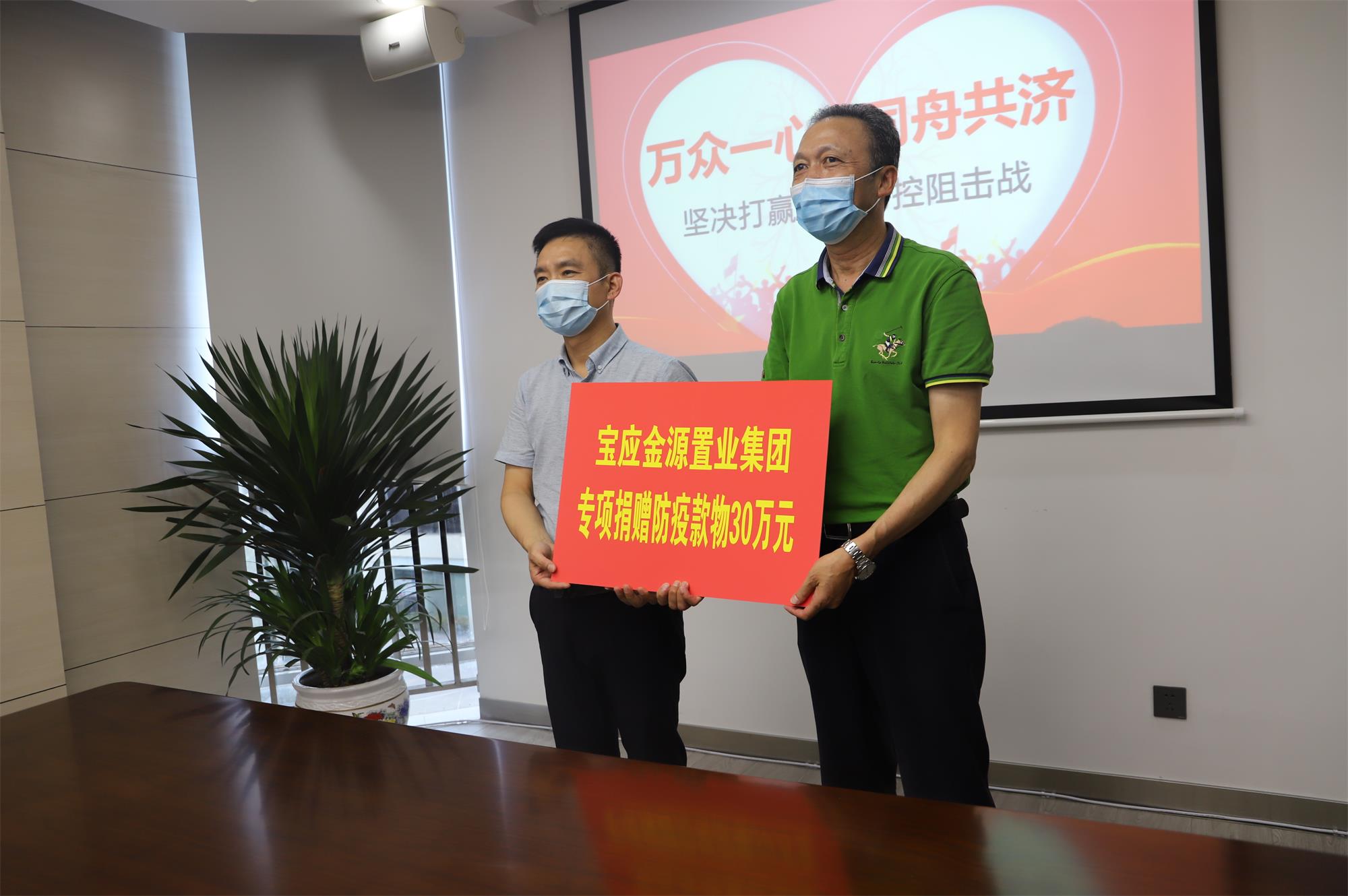 当前,扬州市防控形势十分严峻,疫情防控已经进入最关键、最吃紧的阶段。宝应人民与全市人民一道,众志成城,同舟共济,为坚决打赢疫情防控阻击战作出贡献。宝应金源置业集团去年疫情防控期间带头捐赠10万元。今年面对严峻的疫情形势,郭红星董事长牢记社会责任,积极奉献爱心,今天委托集团副总经理吴兵、慈善工作站站长董洪章专程来到县慈善总会再次捐赠20万元资金和10万元物资,购买的方便面、牛奶、花露水、矿泉水等物资,已及时送往县人医、县中医院、县开发区派出所、金阳物业、七里、东方红、金湾社区防疫一线。